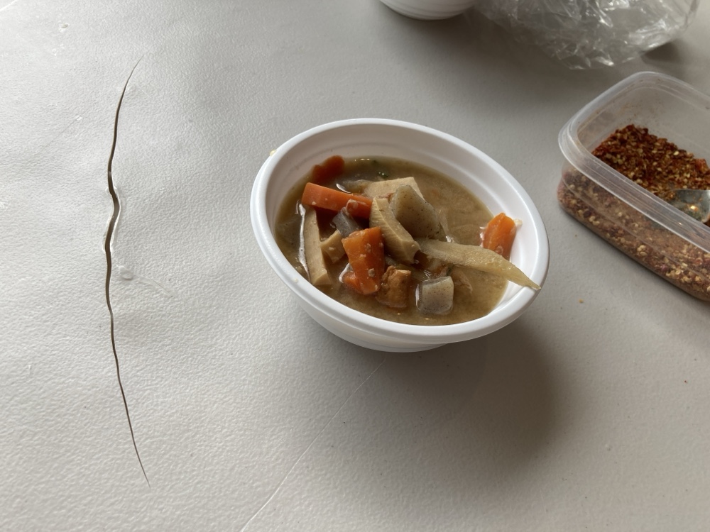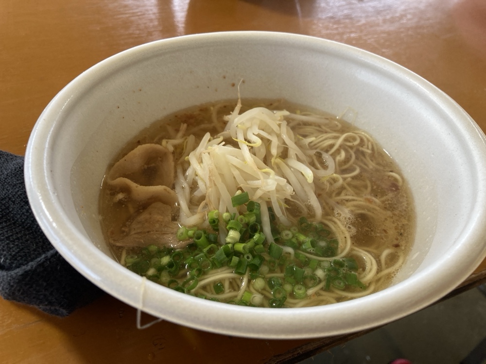 4~5年前(?)から連続するこのサービス、実は運営サイドによる「朝食がわり」のおおもてなしと聞いております。ツールドおおすみ初参加のサイクリストはまあ、たいがいメン食らうわけですね。麵でなくて豚汁でしたが。。。