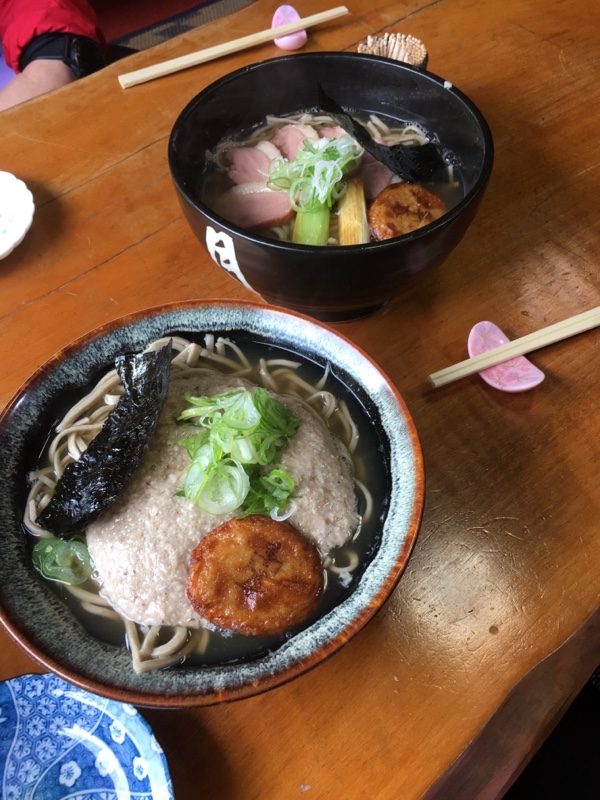 いつもの川辺峠途中のお蕎麦やさんは臨時休業中でしたので、手前の重吉そばさんで昼食をいただきました。写真は「山かけそば」と「鴨南蛮蕎麦」です。