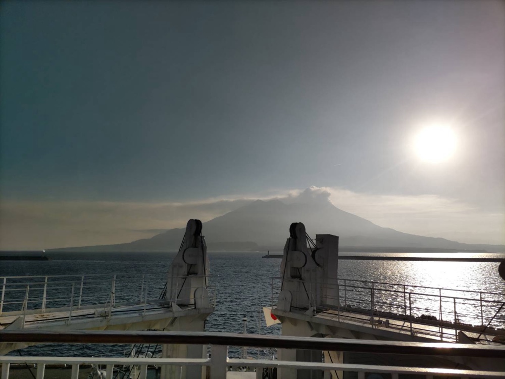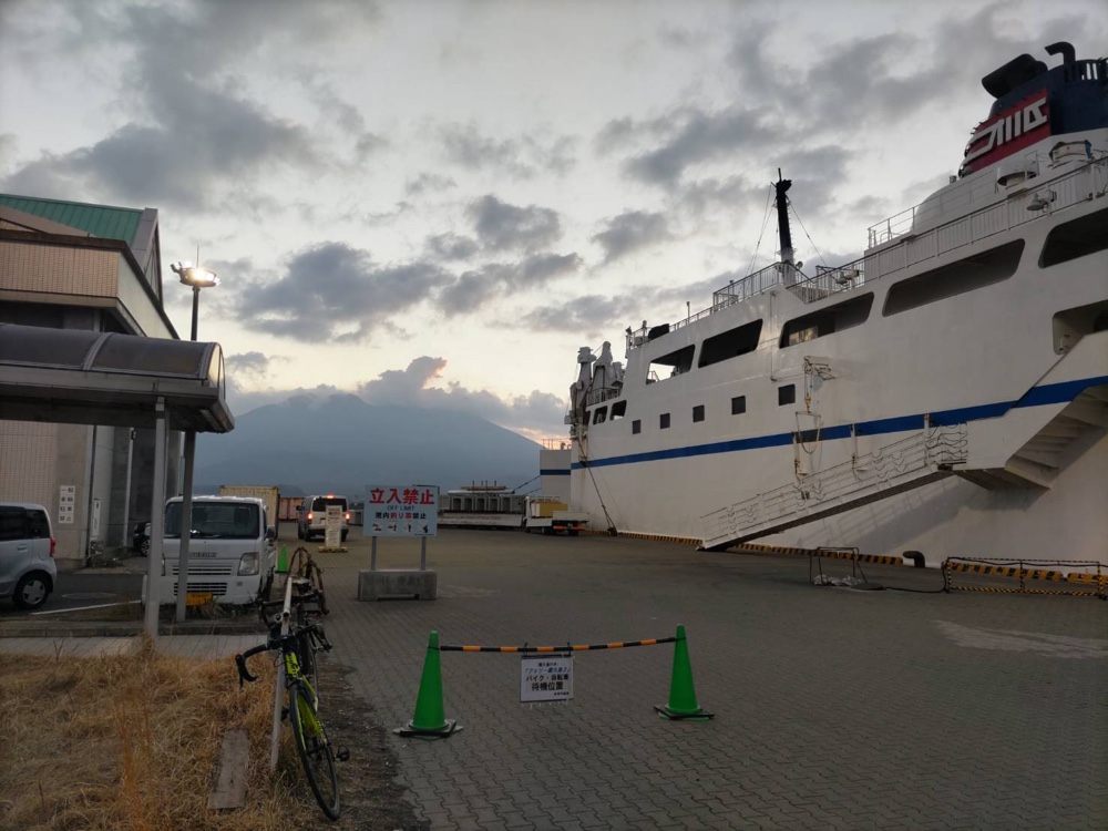 フェリーに自転車はそのまま乗せるのは5台までです。東京からの参加者さんとボクだけでした。東京からの参加者さんは、飛行機輪行して、高速バスにも、輪行袋で自転車つめたそうです。鹿児島市内に前泊されたそうです。