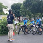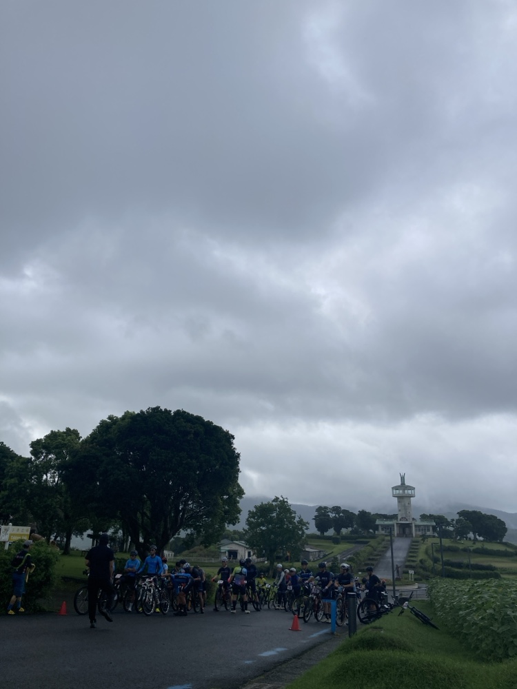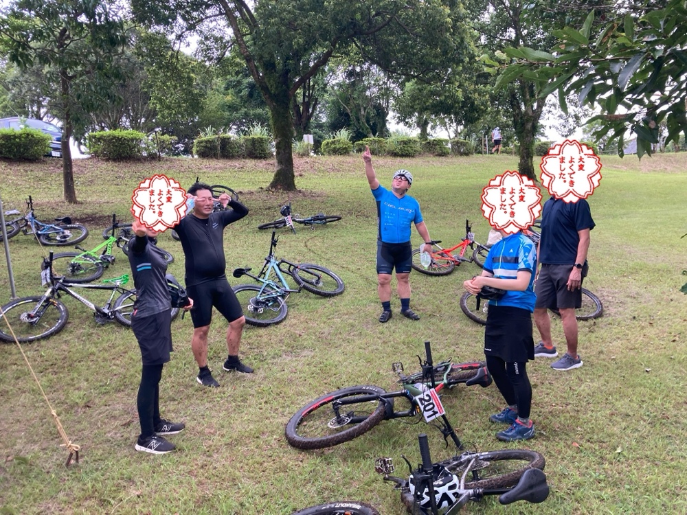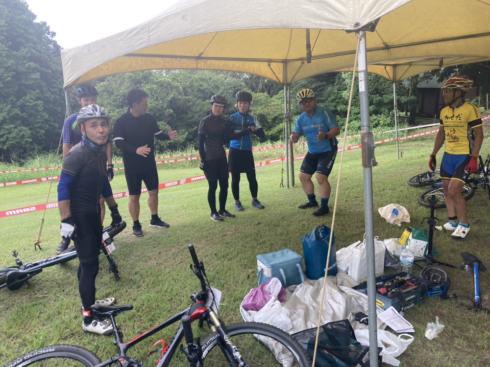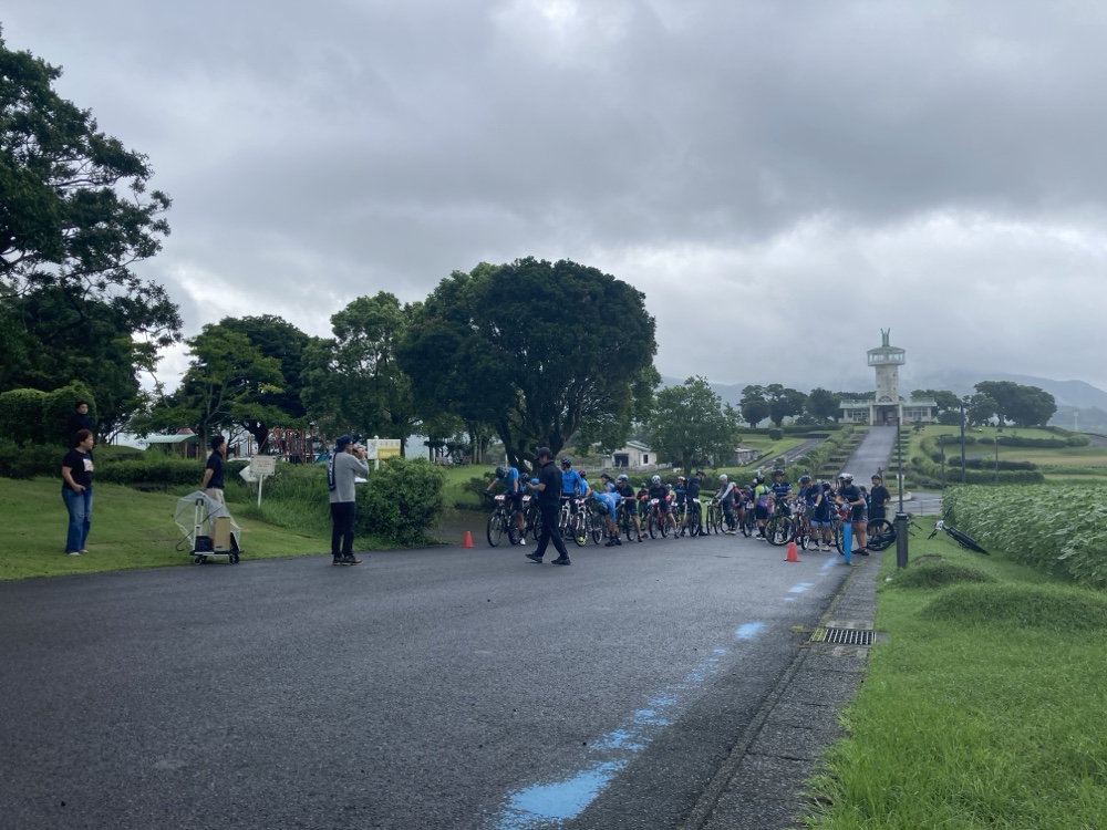 スタート前のライダーズミーティング。鹿屋のバイシクルショップ「フロッグサイクル」のオーナー、児玉さん(写真右側)から。