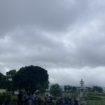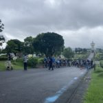 スタート地点に並びに行ったところで、やや強めに雨が降り出しました。すでに濡れる覚悟は出来てるのですが、しばし木陰で雨宿り。