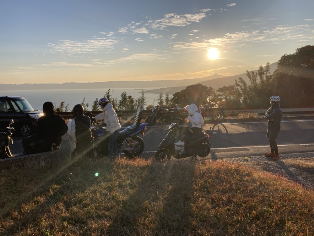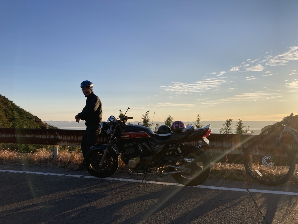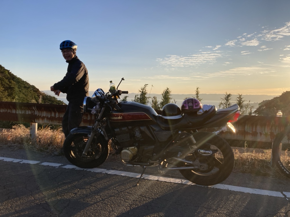 許可をもらって集合管バイクと初日の出の撮影。「ブブン、ブンブブンブン、のポーズ」(撮影、お客様)