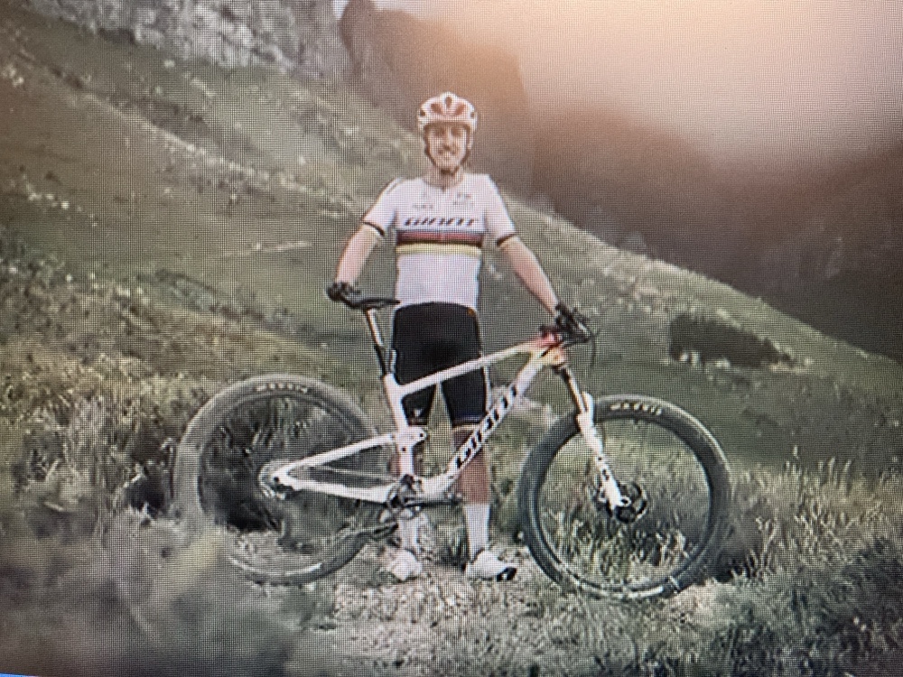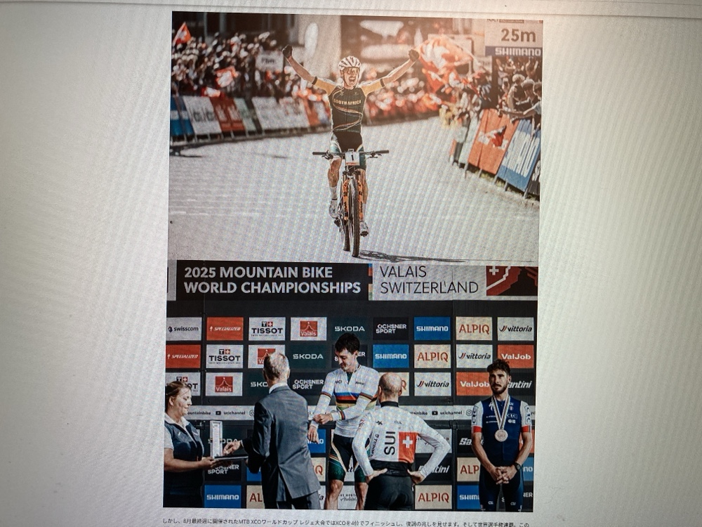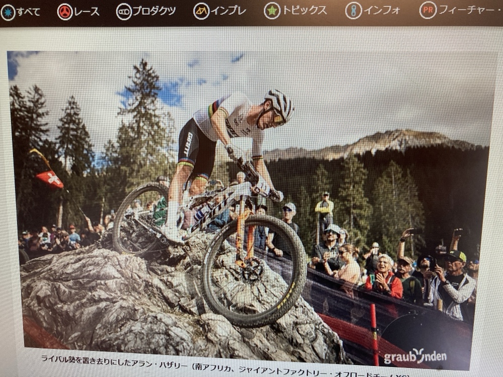 でこちら、MTB世界選大会の翌週にワールドカップXCO大会が同じスイスで開催されていて、件(くだん)の選手が早速アルカンシェル姿で登場、プロトタイプANTHEMでブッチギりの優勝を果たしてくれたのでありました‼️