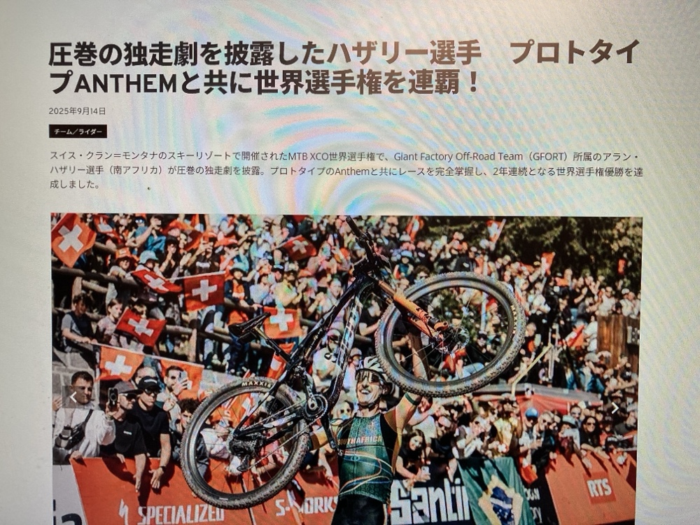 GIANT社のプロトタイプ【ANTHEM】が今季からワールドカップなどで実戦投入され、今年からジェイコアルウラーにも所属する「アラン・ハザリー」選手が、9月14日(日曜)にスイスで開催された世界選手権MTBクロスカントリーにて、プロトタイプANTHEMに乗ってブッチギりの優勝を果たしました‼️