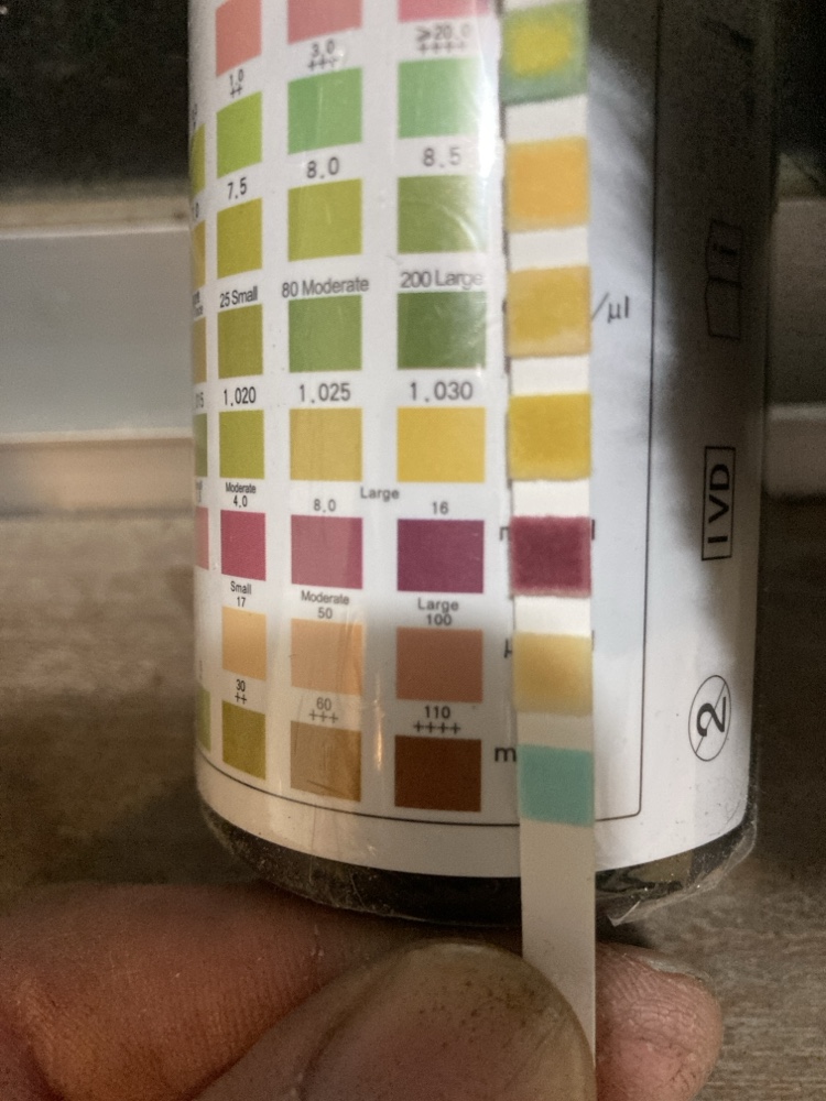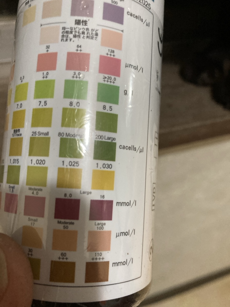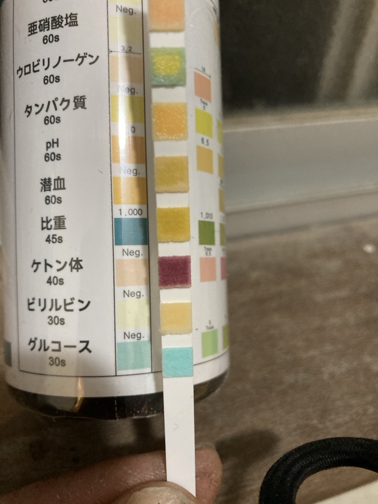 試験結果の色は濃い紫色で、カラーチャートの良くない方の端っこで16mmol/l   (???????)