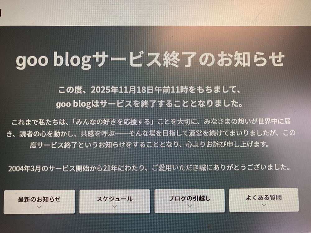 中島が2006年から2018年ごろまでお店のホームページとして利用していた「gooブログ」さんが、2025年11月18日午前11時をもって終了しました。