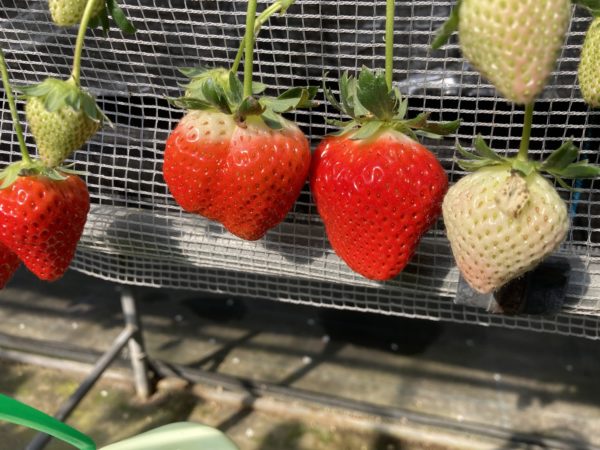 おお、外から見ても、赤く色付いたイチゴがたくさん生ってる‼️