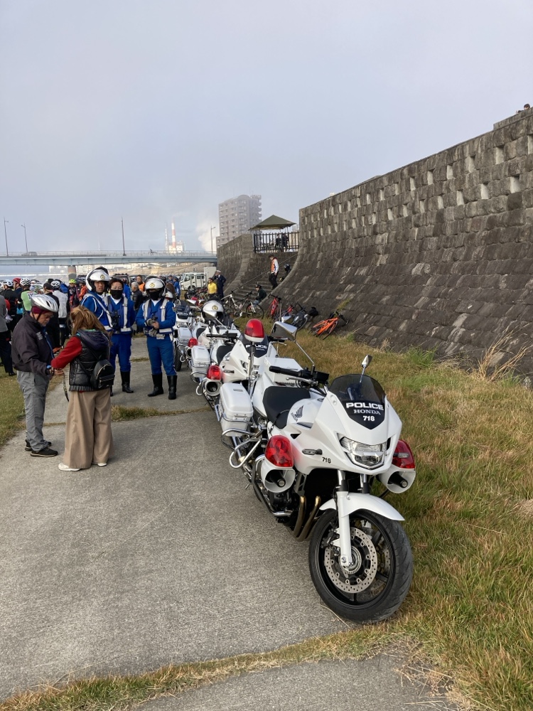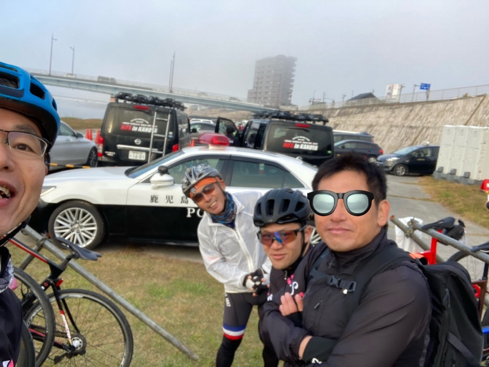 こちら、朝一番の写真、開会式前ですね。お客様方と。パトカーに護送されないよう、気をつけて走ります!