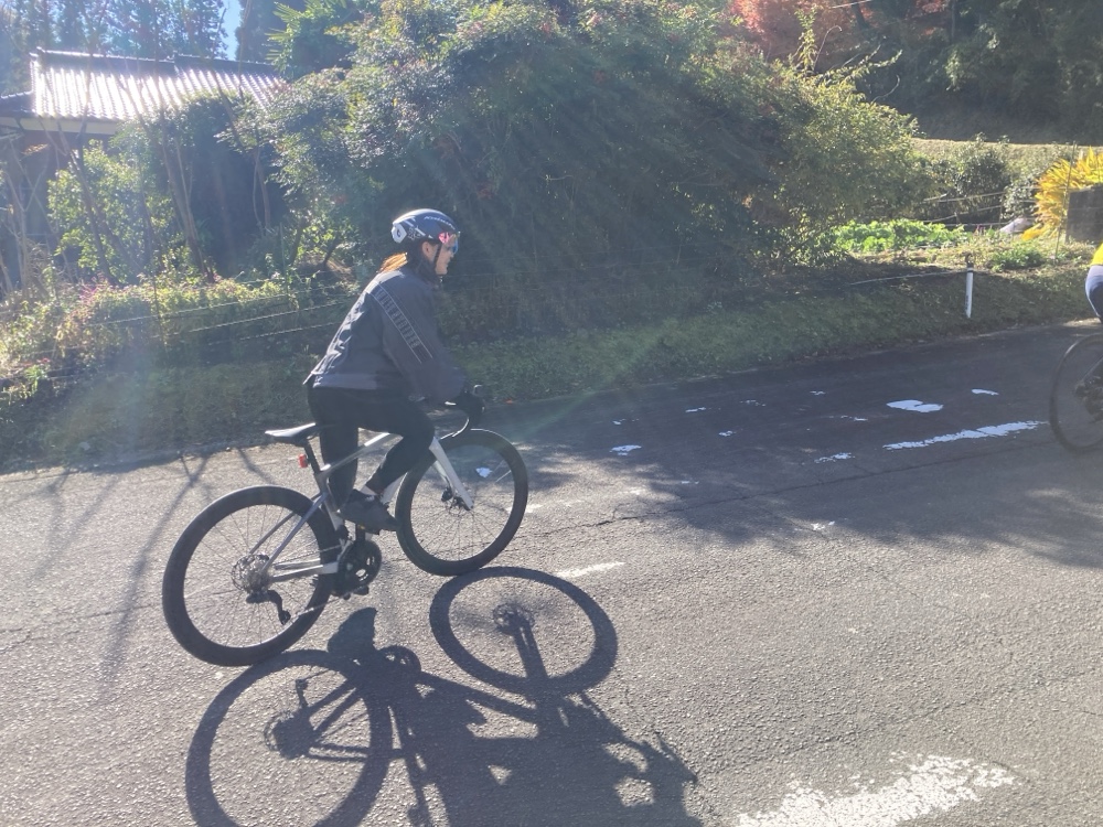 運営の方の話では、ゲストライダーでも実走しない方が多い中で、角田さんは車の移動を交えながら、Bコース、Aコースと、上り区間を中心に参加者と一緒に走ってくださってました。ペダルはまだノーマルですが、上級者コースを普通に走れる風にお見受けしました。Bコースの豚汁を美味しそうに召し上がってらっしゃって、またかわいい。。。