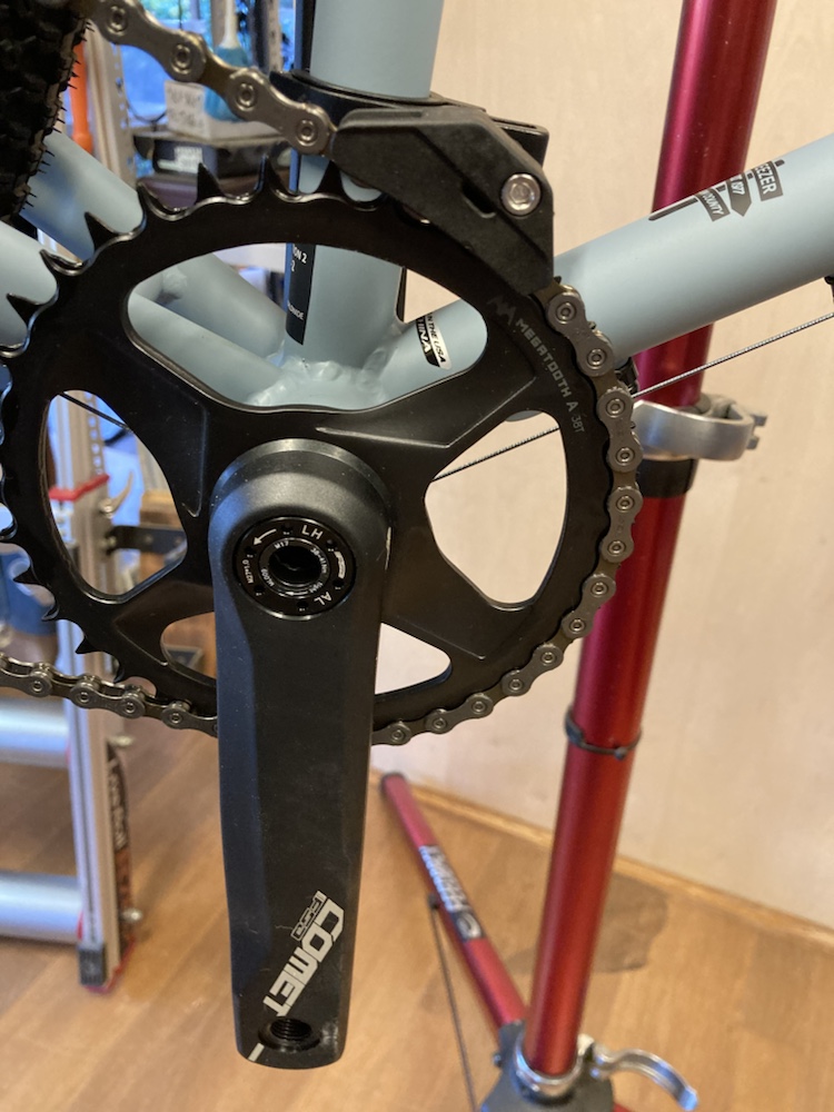 クールなFSAのシングルクランクに、チェーン外れ防止のデバイスがセットされています。最初、「コストダウンのためにノーマルチェーンリングと外れ防止デバイスのコンビ」と思ったら、チェーンリングはしっかり「ナローワイドタイプ」になっている?